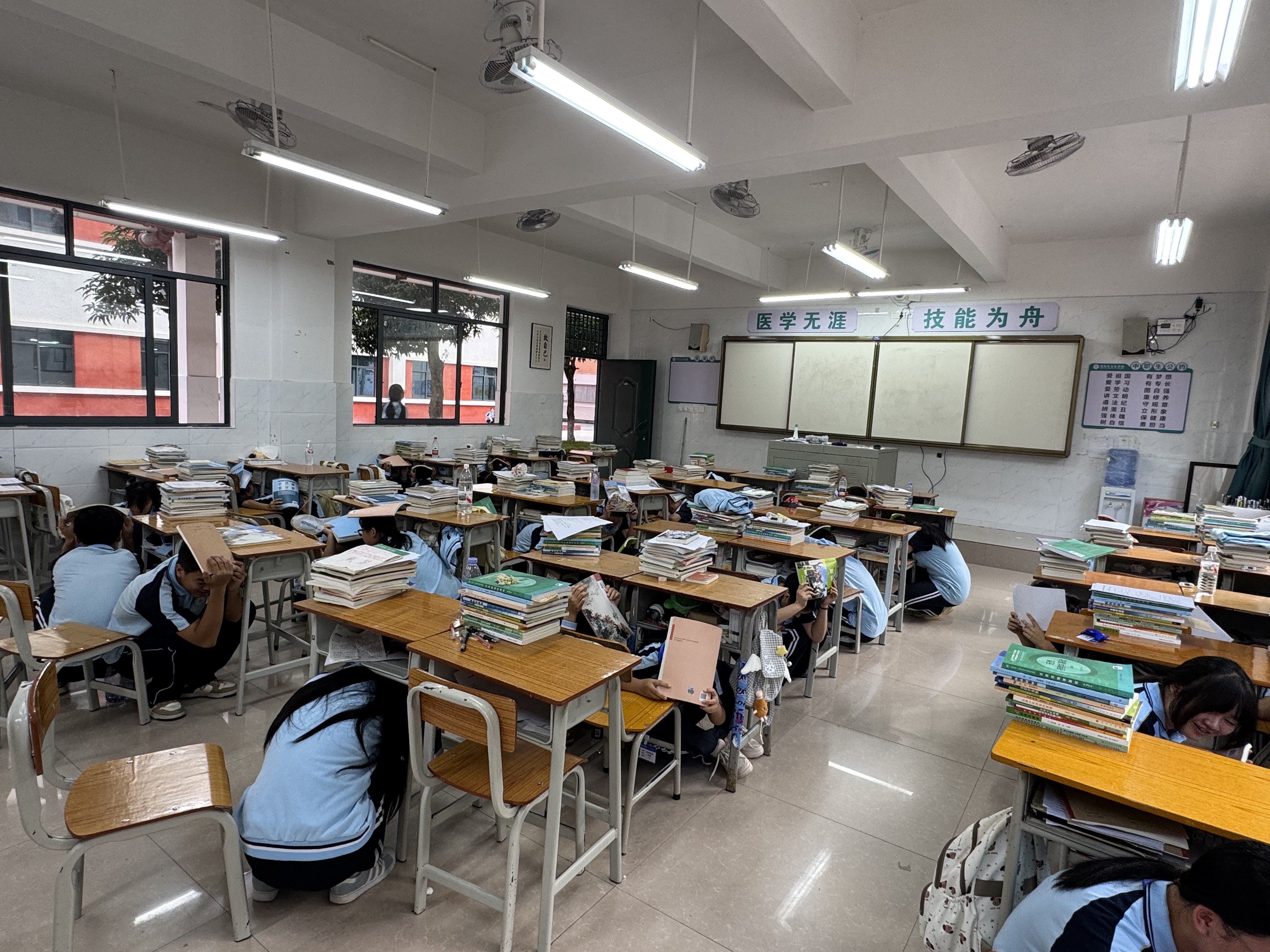 上午8时整,伴随着急促的警报声响起,全体学生迅速按照“蹲下、掩护、稳住”的避险要领,用双手护住头部,就近躲至课桌下或墙角等安全区域,进行科学有效的就地避险。约30秒后,模拟“主震”结束,疏散信号发出,师生们在教师的指挥下,迅速从前、后门分流撤离,沿预定疏散路线快速、有序地向运动场集结。到达指定区域后,各班班长立即清点人数并上报值班老师。整个疏散过程仅用时约7分钟,其中最快班级不到2分钟便完成撤离,充分展现了师生良好的纪律素养与高效的应急反应能力。