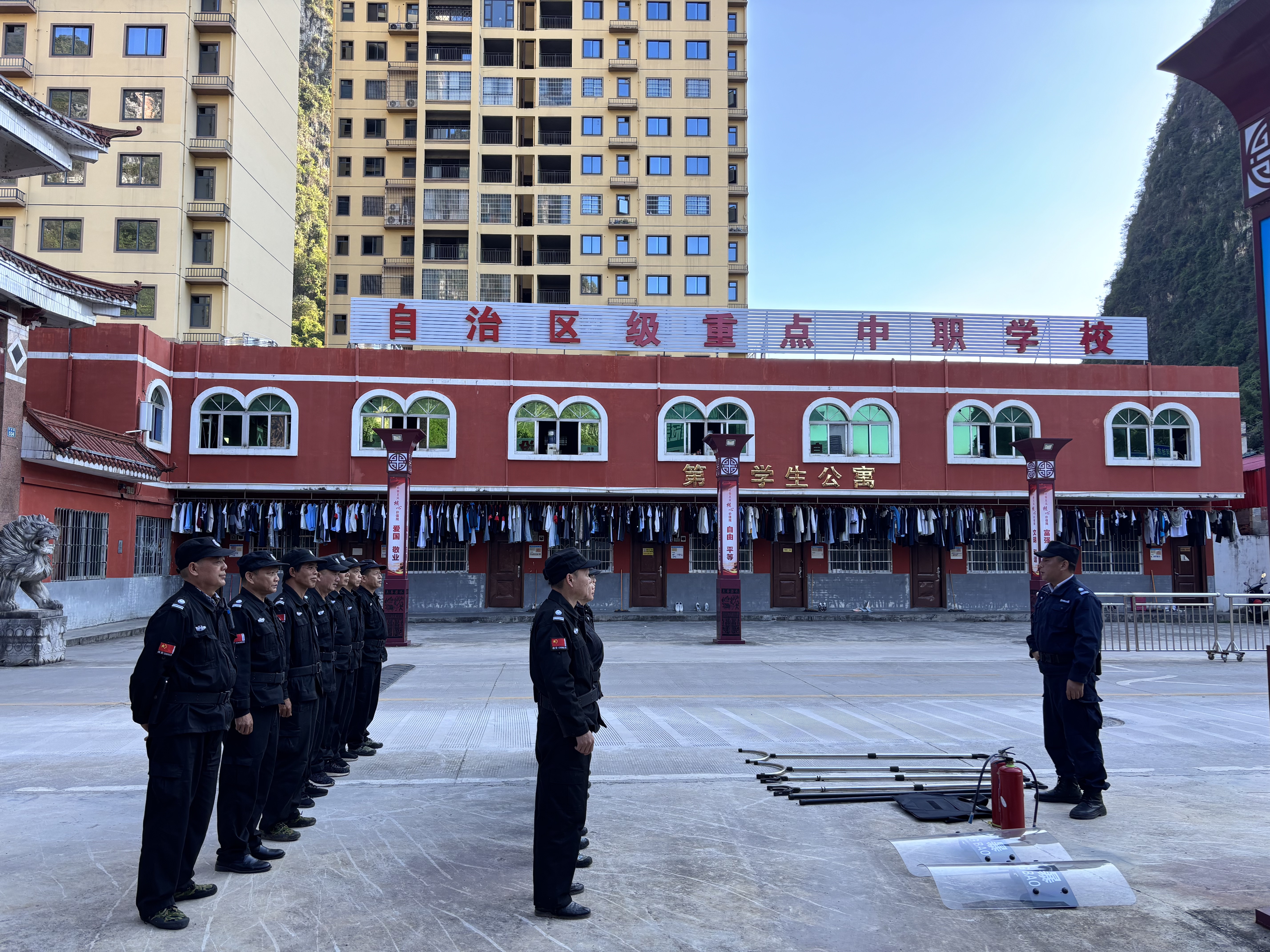 2025年11月14日下午,河池市卫生学校在校门口组织举行了保安消防与安全培训活动。学生科副科长张乐平、校团委书记韦泽榜及全体安保人员共同参与。