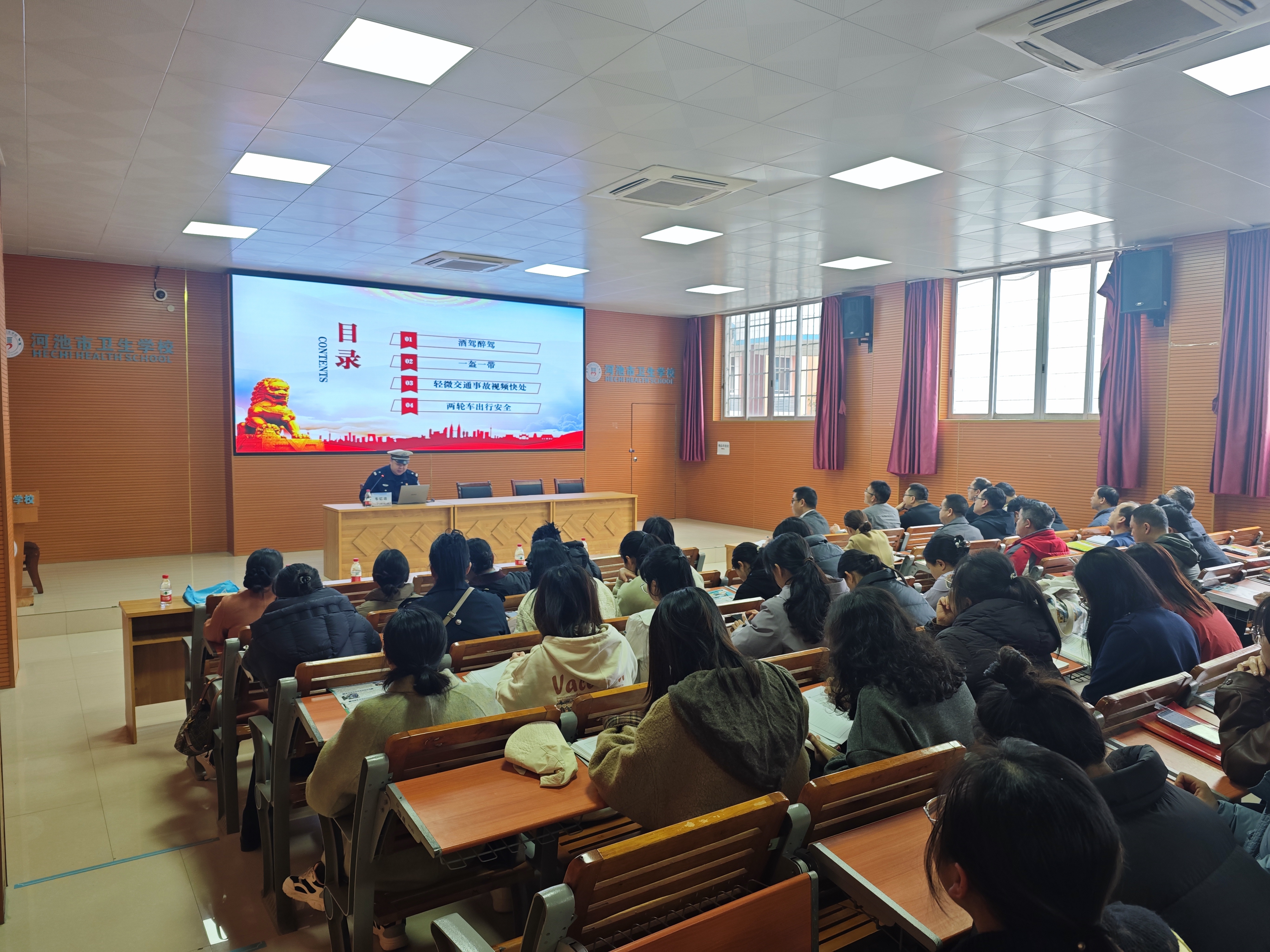 为进一步强化全体教职工交通安全法治意识,提升安全出行与应急处置能力,营造安全、文明、有序的校园交通环境,2026年3月20日,河池市卫生学校特邀河池市公安局交通管理支队金城江大队教导员韦钇池到校,开展交通安全知识专题讲座。