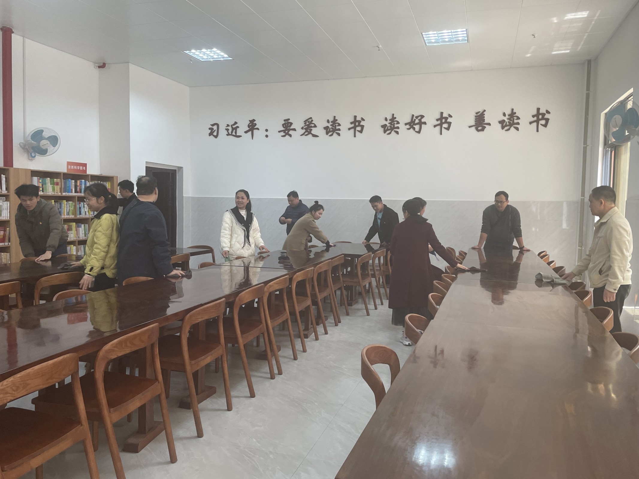 在阅览室打扫卫生、整理图书