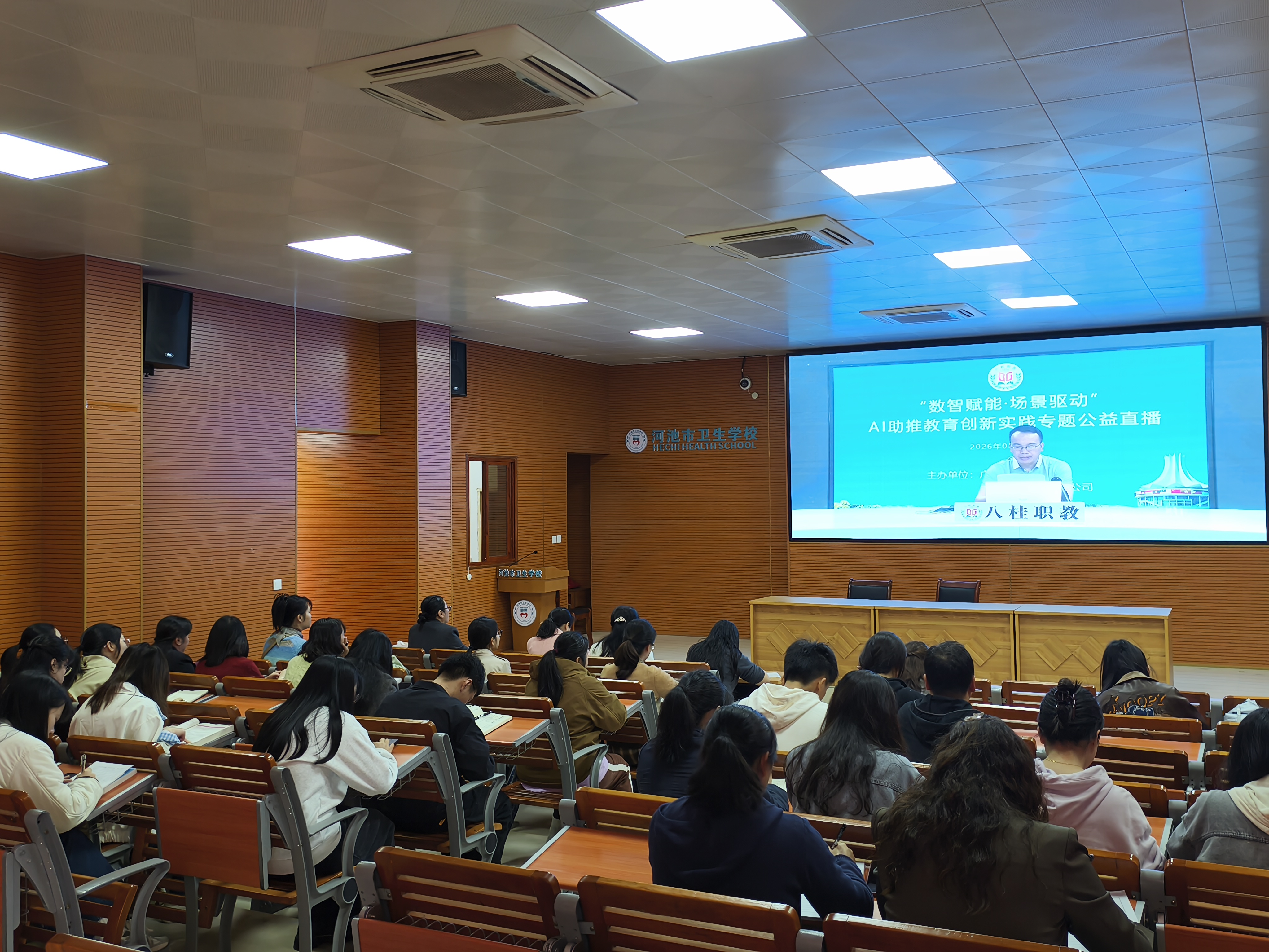 为深入贯彻国家《教育强国建设规划纲要(2024-2035 年)》及广西人工智能赋能教育相关行动方案要求,积极推进学校教育数字化转型,探索 AI 技术与卫生职业教育教学融合的有效路径,2026 年 3 月 31 日上午,河池市卫生学校组织教师参加了由广西八桂职教网主办的 “数智赋能・场景驱动”AI 助推教育创新实践专题公益直播培训,借力前沿数智技术为学校教育教学创新发展蓄能。