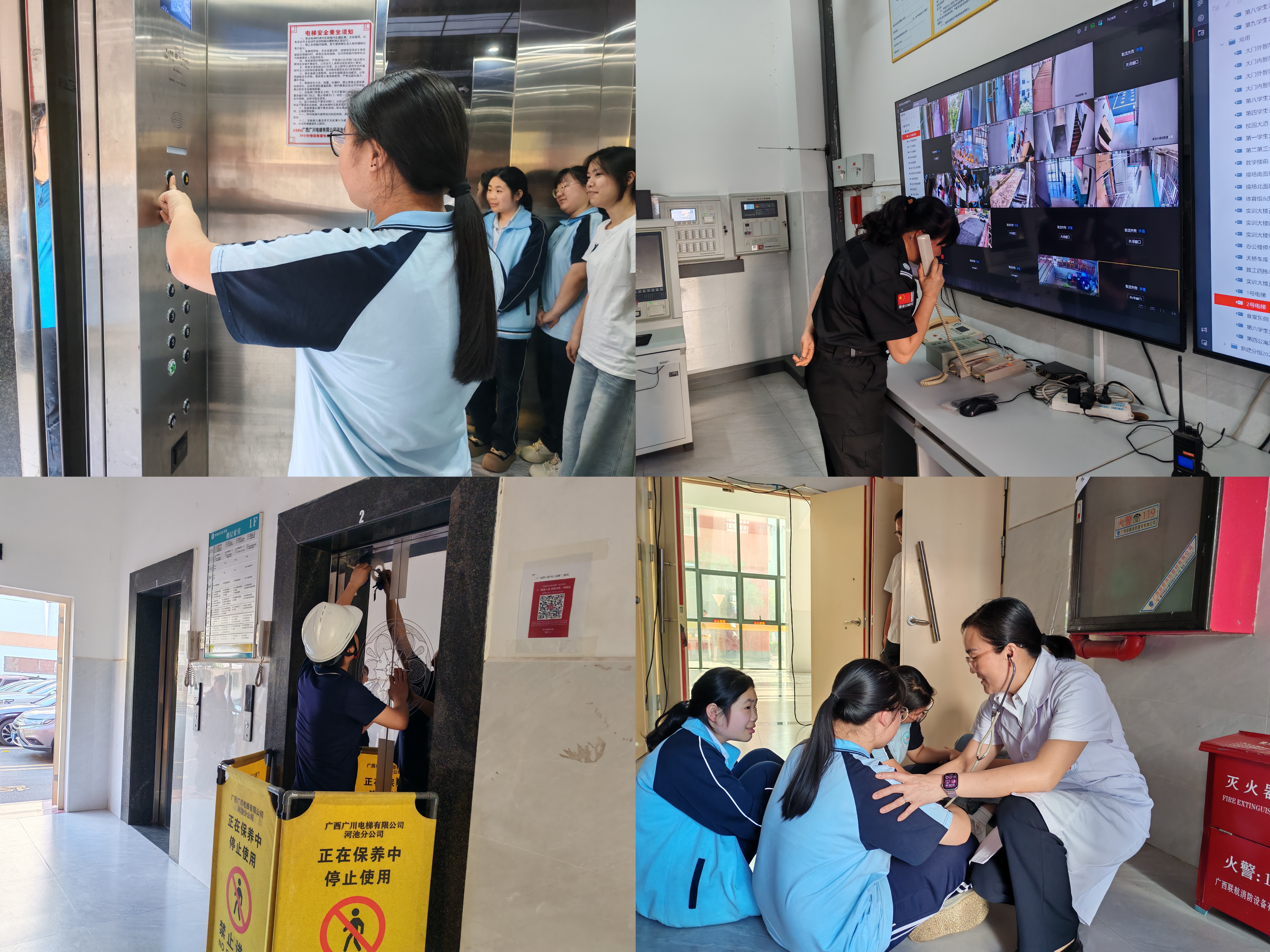 理论培训结束后,应急救援实战演练正式开始。演练模拟师生乘坐电梯时突发故障被困场景:被困人员通过电梯紧急报警装置呼救,监控中心第一时间上报并通知维保人员,安保人员快速抵达现场安抚情绪,维持秩序,校医室全程待命做好医疗保障。在专业人员操作下,“被困人员”顺利获救,整个演练流程衔接顺畅、处置高效、组织有序。